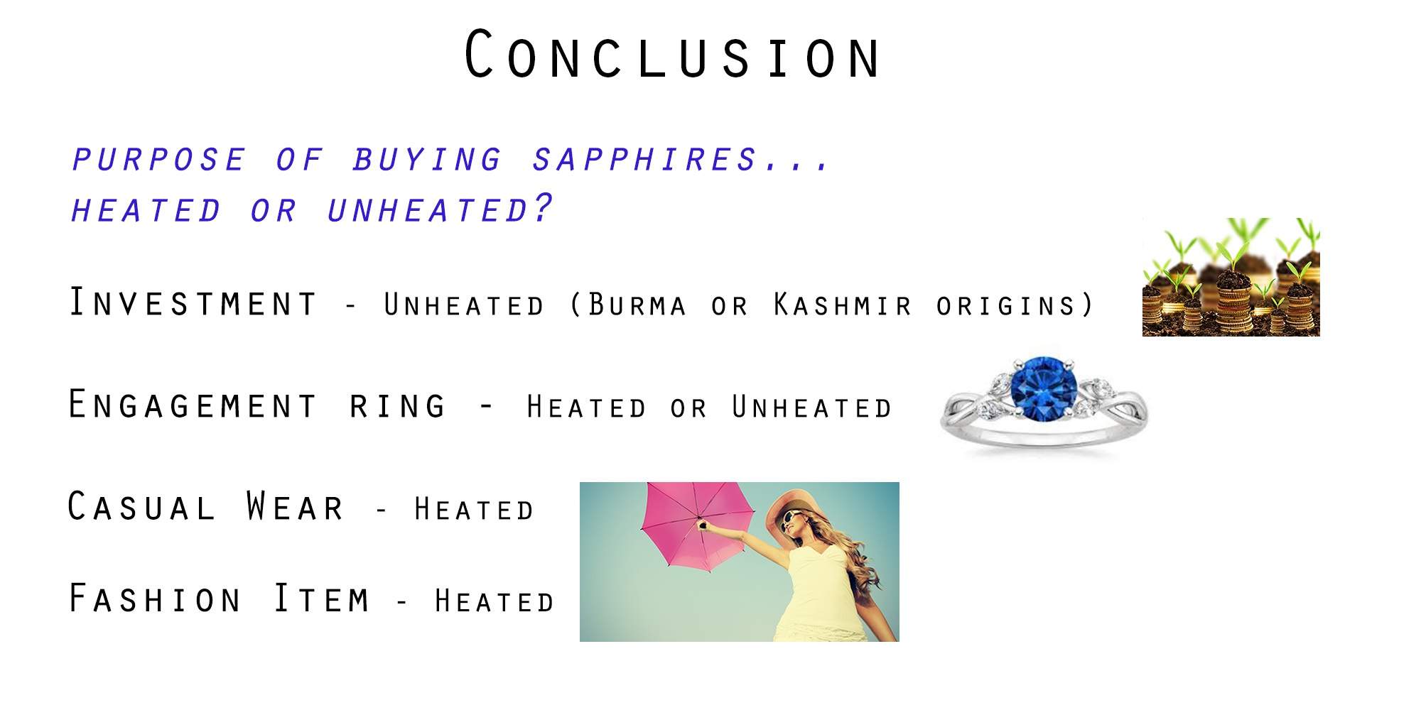 Here is the conclusion – depending on what your purpose of buying a Heated or an Unheated blue sapphire would be. Each purpose with a decision on what should be chosen.