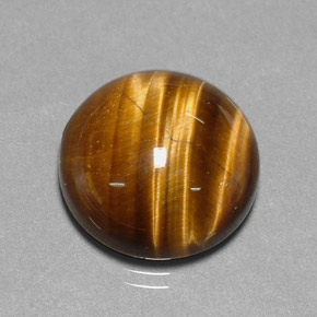 Tiger’s-eye, or tigereye, is a popular and curious material. It consists of compact fibers of quartz that has replaced asbestos fibers. The light reflected from the fibers produces a storng sheen or silky appearance, like that of the original asbestos, known as chatoyancy. Sometimes variation in the color density of the material produces a “cat’s-eye” effect, but more often the appearance is that of shimmering bands of light. Tigereye may vary in color from brown and brownish-yellow to blue and blue-green. The latter hues are generally referred to as hawk’s-eye or falon’s- eye. Tigereye may be leached in hydrochloric acid and dyed various colors, including red, yellow, gray, blue, and green. These are attractive colors but do not occur naturally. Heating yellow-brown tigereye can sometimes oxidize the iron that causes the brown coloration, producing reddish tones.